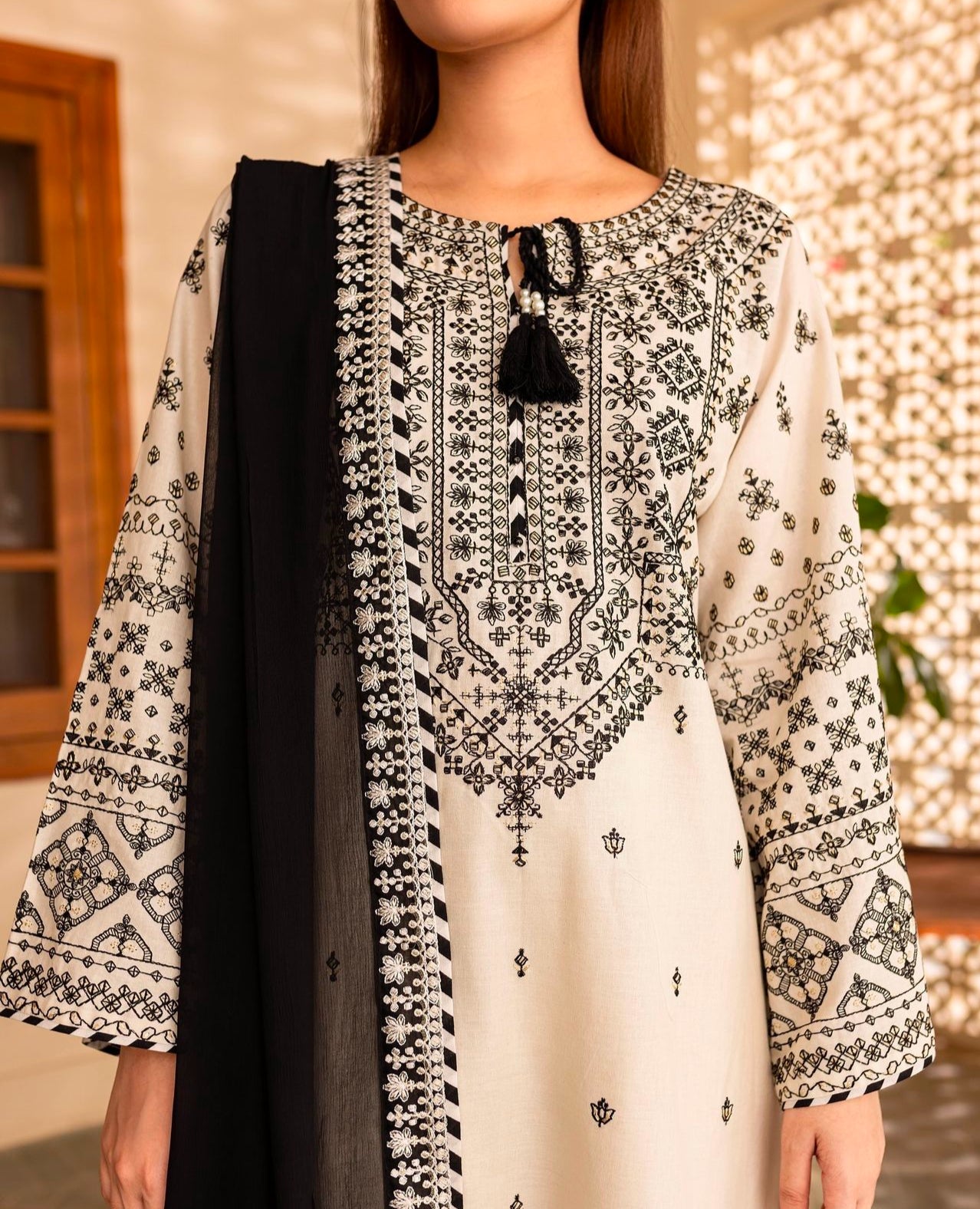 This 3-piece White kurta set exudes elegance with intricate embroidery on the shirt, loose-fit sleeves, and a crinkle-chiffon dupatta featuring detailed borders. Paired with embroidered linen culottes, it offers a perfect blend of timeless style and modern sophistication.