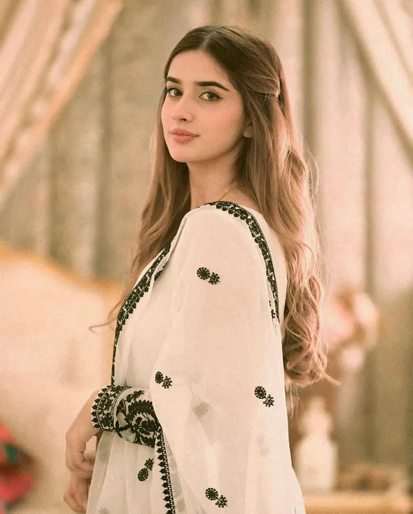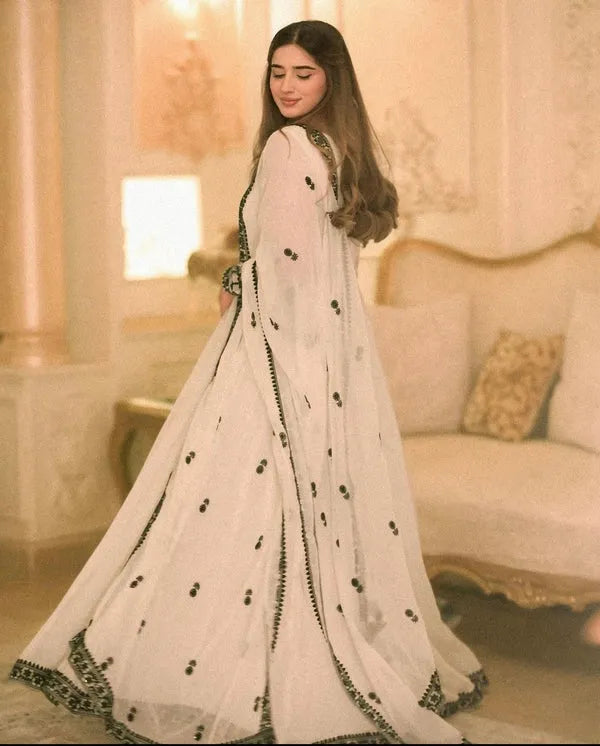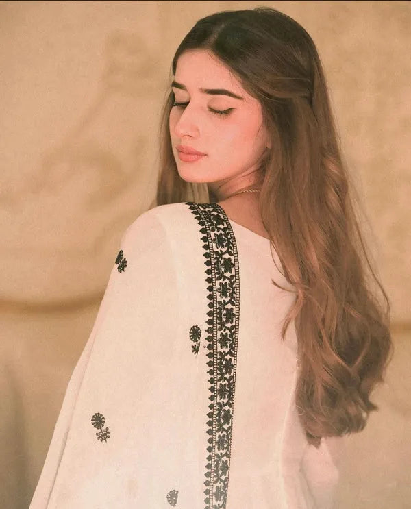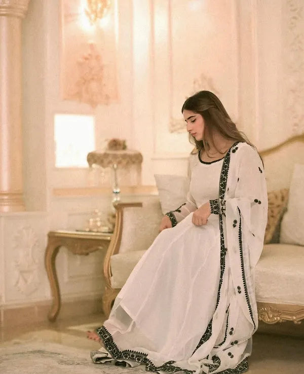 Elevate your wardrobe with our Glamour Chiffon Maxi 3pcs set. This stunning off-white crinkle chiffon frock is beautifully embellished with intricate black thread and sequin embroidery, making it a true statement piece. The detailed embroidery, especially on the gheera sleeves and dupatta, creates a striking contrast that adds a touch of sophistication and glamour to your look. Perfect for weddings, formal events, or any special occasion, this maxi set is designed to make you stand out with elegance and style.