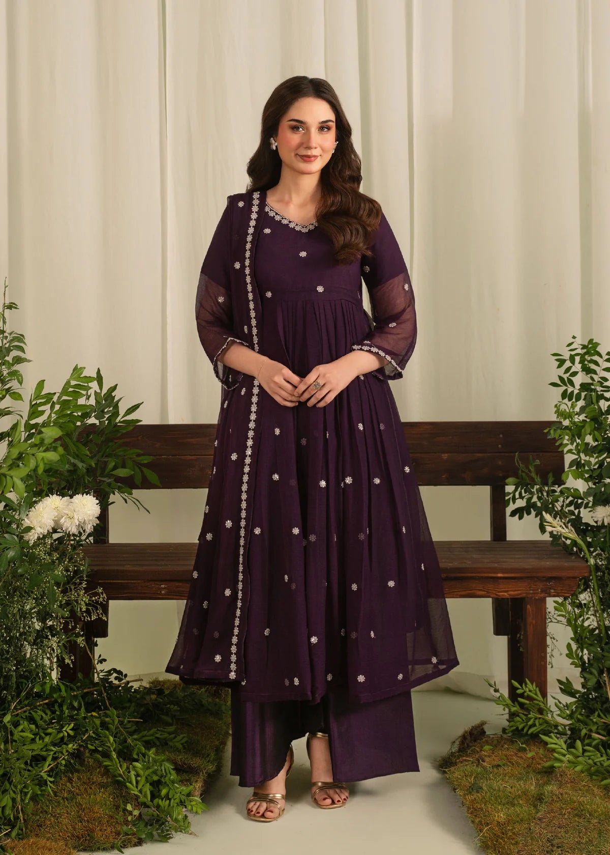 Step into effortless elegance with this enchanting silk Anarkali maxi set in a rich, deep plum shade. Crafted from premium silk, the outfit offers a soft texture and graceful fall, making it a perfect blend of luxury and comfort. The Anarkali is beautifully adorned with delicate white threadwork motifs that add charm without overwhelming the look.