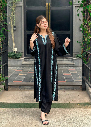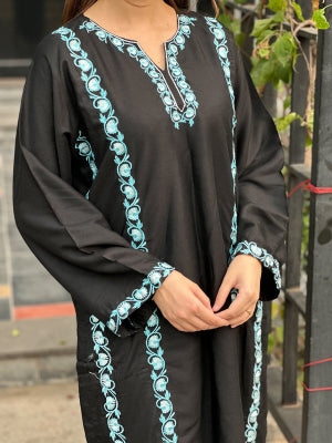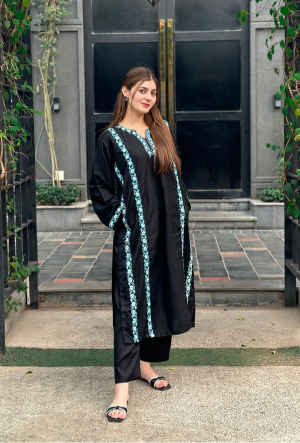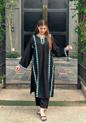 This gorgeous two-piece Premium Linen Co-ord set gestures intricate sky-blue Embroidery making it perfect for your winter outfit. Pocket style looks stunning on this beautiful outfit.