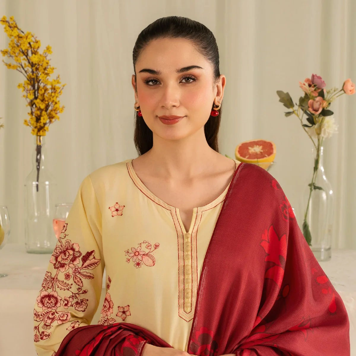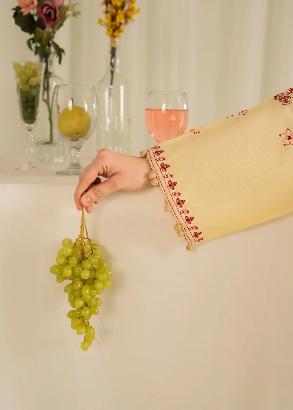 Radiate grace and comfort with this elegant linen kurta set, beautifully crafted in a soft butter-yellow hue and adorned with delicate red embroidery. The intricate threadwork on the sleeves, hemline, and neckline adds a refined charm, while the breathable premium linen fabric ensures ease and comfort throughout the day.